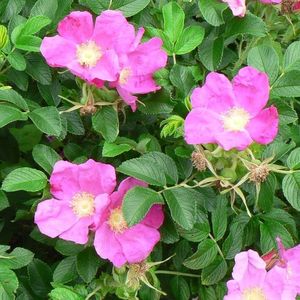 Гибрид розы и ругозы от маэстро Роберта Холмса. Пурпурные цветки — немахровые, слегка морщинистые, размерами до 9 см. Крайне неприхотливый и жизнестойкий кустарник (до 1 м), не требующий ухода. За сезон цветёт несколько раз. Образовавшиеся плоды крайне декоративны, не требуют удаления — напоминают среднего размера помидоры. Срезанные цветы долго не хранятся. В отличие от плодов, которые станут великолепным украшением сухоцветного букета. |