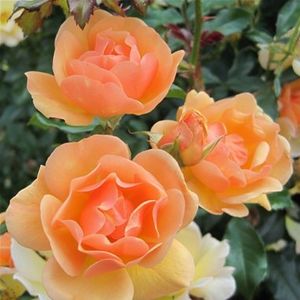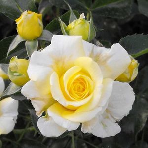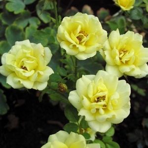 Густомахровые цветки, собранные в кисти по 3-8 штук, покрывают все побеги растения. Цвет лепестков меняется в зависимости от возраста. Молодые — ярко-жёлтые, с янтарным оттенком ближе к центру, по мере распускания постепенно светлеют до лимонного и кремового цвета. Аромат ненавязчивый, слабый. Цветение обильное, повторное, до конца сентября. Листва мелкая, глянцевая, тёмно-зелёная очень красивой формы. Куст невысокий, до 70 см, с большим количеством дуговидно поникающих побегов. Лучше всего подходит для патио и миксбордеров. |