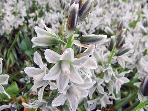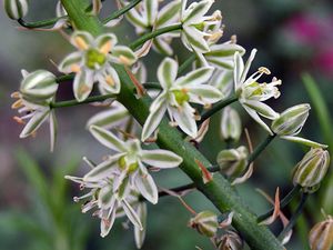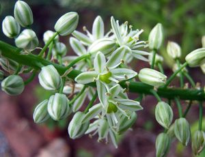 Птицемлечник хвостатый (Ornithogalum caudatum) или индийский лук, ядовитое и в то же время целебное растение родом из Южной Африки. Это раскидистый птицемлечник с широкими ремневидными плоскими повисающими листьями длиной до 80 см и множеством белых ароматных цветков с зеленоватой серединой, собранных по 50-100 штук в кистевидное соцветие длиной иногда до метра.