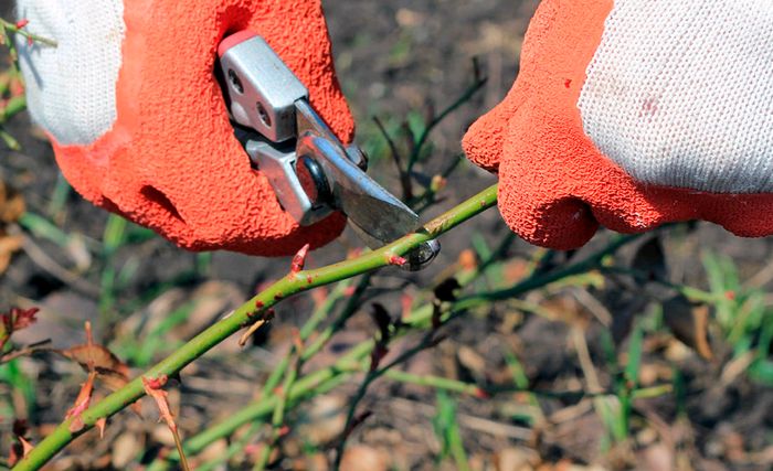После обрезки удалите с побегов все листья, надев перчатку и проведя рукой по побегам снизу вверх, чтобы не повредить почки.
