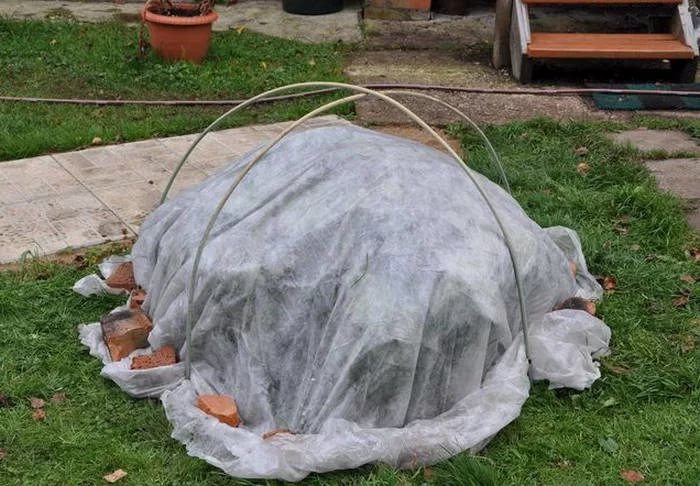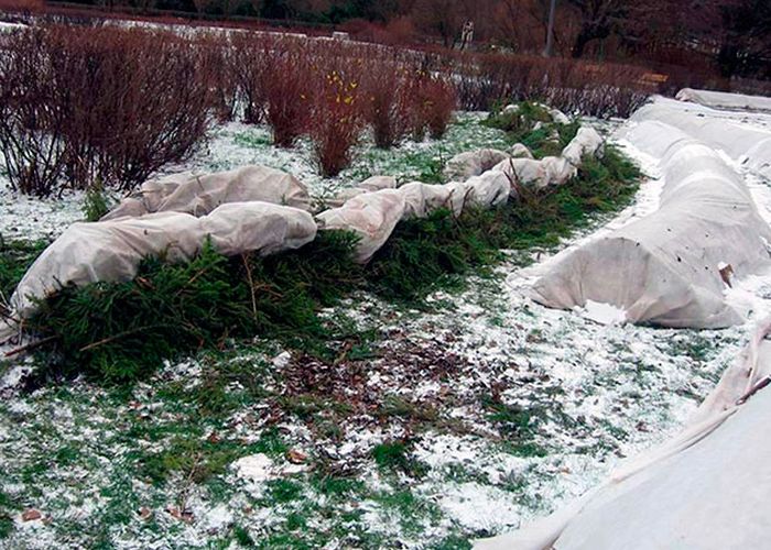 Плотность материала должна быть не менее 200 г/м², причем нужно сложить материал в несколько раз. Натянутое на каркас нетканое укрытие нужно понизу обложить длинными досками и прижать кирпичами. Если при укрытии растений пленкой необходимо оставлять душники, то спанбонд, лутрасил и геотекстиль нужно надежно закреплять по всему периметру, чтобы нигде не оставалось отверстий, через которые будет проникать холодный зимний воздух.