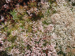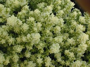 Многолетний очиток распространен на севере нашей страны. Образует низкий стелющийся ковер из зеленых стеблей и мелких листьев. Соцветие метельчатое, содержит душистые белоснежные цветки. Зимостоек и прекрасно растет в полутени. Наиболее распространенные сорта: