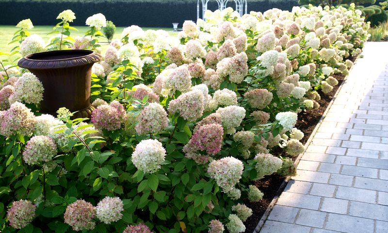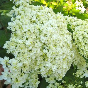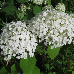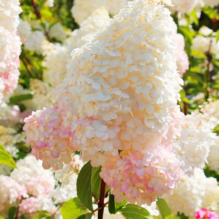 Восхитительная красавица с лёгким румянцем в пышных, как взбитые сливки, крупных соцветиях диаметром до 25 см в диаметре. Кустарник около 3 м высотой и с таким же диаметром кроны. Цветёт обильно и продолжительно с июля по сентябрь. Прекрасно зимует без укрытия, выдерживает морозы до –34°C. |