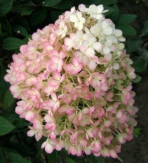 Куст высотой до 1,3 м, с компактной кроной. Соцветие широкопирамидальное, почти шарообразное, плотное, до 40 см длиной. Стерильные цветки сначала чисто белые, а затем быстро розовеют, осенью пурпурно-малиновые. Цветет с июля до октября. Сорт морозостоек. |