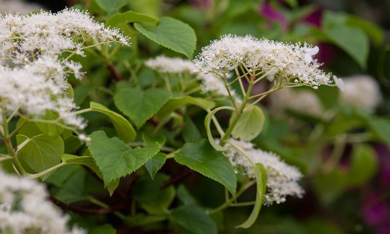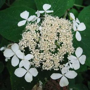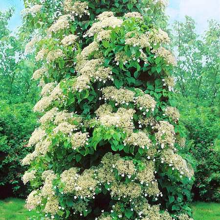 Вьющаяся или черешковая гортензия – это лиана. Побеги этой гортензии одеревесневающие, растут они медленно. Черешковую гортензию используют либо как почвопокровную культуру, либо как живую изгородь – на шпалере. Вьющаяся гортензия способна подняться до 20 метров в высоту, цепляясь присосками и воздушными корнями за опору. Соцветия – щитковидные. Гигантская лиана «набирает обороты» постепенно, молодые саженцы все свои усилия сосредоточивают на формировании мощной корневой системы, которая в будущем обеспечит им активный рост побегов. Наибольшей декоративности и пышности цветения достигает на открытых солнечных участках или при лёгком затенении. Почвы предпочитает хорошо окультуренные, рыхлые, плодородные, особенно чувствительна к недостатку влаги, что следует обязательно учитывать при выращивании этой красивейшей лианы. Зимует хорошо, укрытие требуется только молодым саженцам с неокрепшей корневой системой. Весной подмёрзшие молодые побеги обрезают.