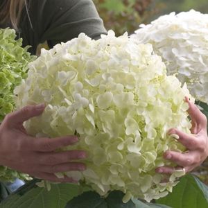 Изюминкой сорта являются цветки большого размера. Но нравится садоводам этот сорт и тем, что меняет изначальный окрас лепестков, со временем, с зелёного на белоснежный. Куст взрослого растения достигает до 1,5 — 3 м в высоту. Стебли растения недостаточно прочны поэтому когда гортензия цветёт, они низко склоняются к земле под весом больших соцветий, которые могут быть в диаметре до 30 см. |