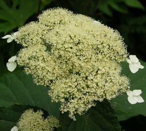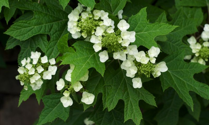 Необычная гортензия с крупными листьями, внешне напоминающими листья дуба. Цветет почти все лето немахровыми белыми цветами, собранными в рыхлые метелки. Не столь броское как у других гортензий цветение с лихвой компенсируется ярко-багряной осенней окраской листьев, украшающих растения до декабря. Высота кустов до 2 м. Растения морозостойки, подмерзают только в очень суровые зимы. Почвы предпочитают кислые и слабокислые, влажные. Хорошо отзываются на мульчирование приствольного круга сосновой корой и хвойным опадом.