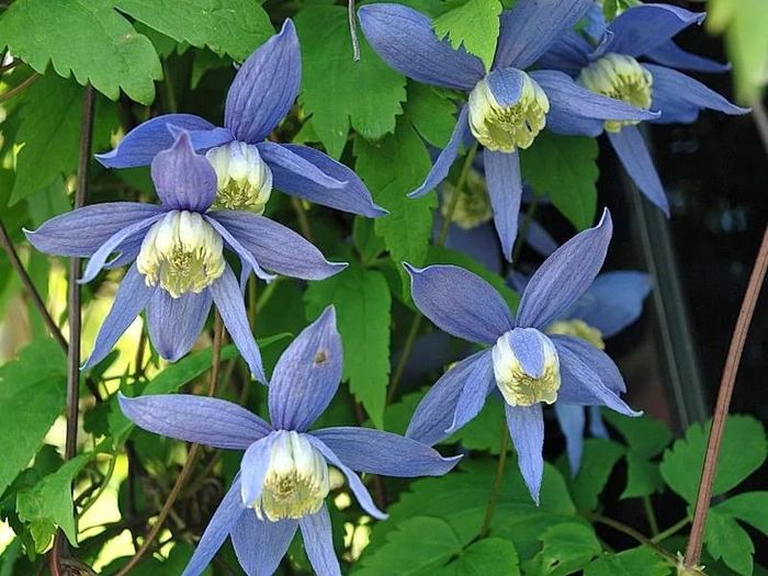 • Клематис "Мульти Блю" – лиана высотой до 2,5 м, сине-фиолетовые махровые цветки величиной в 14 см в диаметре располагаются по побегу в несколько ярусов. Цветет в июне-августе.