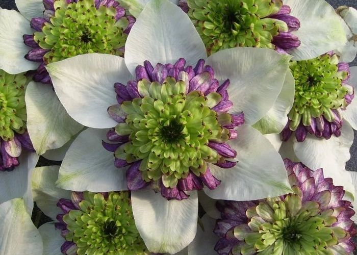 Это клематисы, полученные от скрещивания клематиса Ланугиноза с клематисом Витицелла, представляющие собой в большинстве своем крупные кустарниковые лианы с побегами длиной до 4-6 метров и хорошо развитой корневой системой. Листья у них перисто-сложные, состоящие из 3-5 больших листочков, бутоны удлиненные, цветки одиночные или собранные по 3 штуки, раскрытые, направленные в сторону и вверх, без запаха, всех возможных оттенков, кроме белого. В диаметре цветки этой группы достигают 20 см, хотя есть сорта, у которых цветки всего 8 см в диаметре. Цветут сорта этой группы обильно и долго на побегах этого года, которые зимой обрезают до уровня земли или оставляют побег с тремя-пятью парами почек. Популярные сорта: