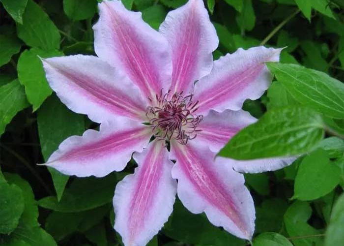 • Клематис "Star of India" – кустарниковая лиана с побегами до 3 м длиной. Сложные листья состоят из 3-5 цельных или лопастных овально-заостренных листочков. Цветки раскрытые, до 15 см в диаметре, ромбовидные чашелистики сочно-фиолетовые с пурпурной полосой вдоль середины, пыльники светлые. Цветет во второй половине лета очень обильно.