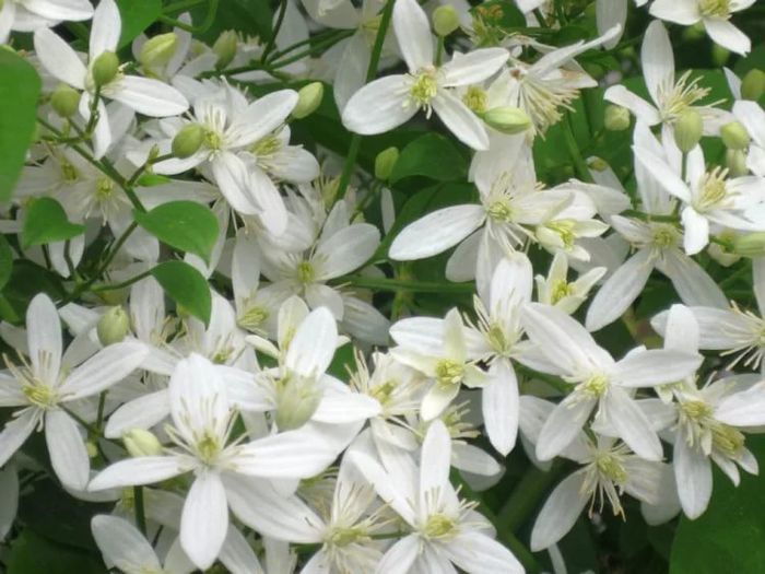 Гигантская лиана до 9 м высотой, листья мелкие, острые, собранные в пучки по пять штук цветки на длинных цветоножках – белые, 4-5 см в диаметре, тычинки желтые. Не любит холодных зим. Популярные сорта: