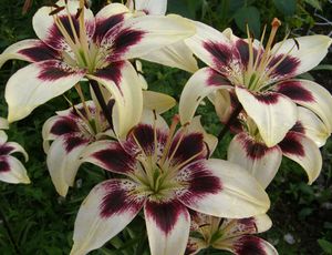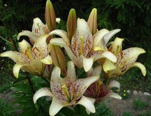 Это самая популярная и большая группа гибридов. Они самые неприхотливые, морозоустойчивые, растут на любой почве. Цвести начинают в начале июля, поздние сорта в конце месяца, цветение продолжается 2 недели. Запаха у цветов нет. Вырастает много деток — быстро размножаются. Цветки азиатских гибридов по форме напоминают чашу. Окраска таких лилий может быть самой разнообразной: белой, желтой, кремовой, оранжевой, розовой, красной и бордовой. Встречаются также виды с очень темными, почти черными, бутонами. А еще есть разновидности с двух- и трехцветными цветками. Популярные сорта: бело-розовая "Marlen", ранняя двухцветная "Lollipop", вишнёвая "Cola", трёхцветная "Tinos", жёлто-красная "Oklahoma City", тетраплоидные лилии из групп "Перл" и "Вэлли", экзотические Tango-гибриды – "Golden Stone", "Olina", "Black Spider", "Pup Art", "Lion Heart".