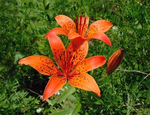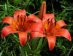 Тигровая лилия. Лилии тигровые или ланцетолистные относятся к неприхотливым многолетним растениям. Среди других видов лилий, ланцетолистные лилии являются одними из самых популярных. Растение ценится за выносливость, декоративное и продолжительное цветение. Почколуковички, образующиеся в пазухах листьев, придают особую изысканность растению. Цветки крупные, около 8-12 см в диаметре, оранжевого, желтого, красного, розового окраса с темно-фиолетовыми вкраплениями. Встречаются махровые формы, цветки не имеют запаха. В высоту достигает около 100-120 см, декоративность сохраняется до окончания цветения. Цветение начинается в июле и длится в течение 20-25 дней. Популярные сорта: Спленденс, Роял Соверин, Мальмо.
