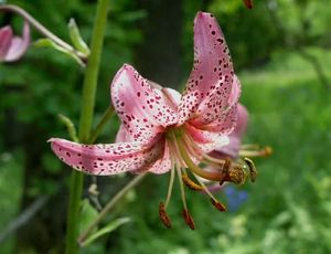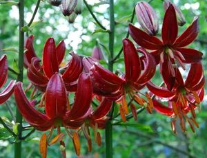Кудреватая лилия. Это очень неприхотливый и морозостойкий вид, цветущий во второй половине лета. Многочисленные (темно-каштановые, пурпурно-розовые или розовато-сиреневые) цветки чалмовидной формы, расположены на длинном стебле (его длина составляет порядка 90-120 сантиметров). Размножается семенами или же делением луковиц. Растет как на солнечных открытых местах, так и в тени.