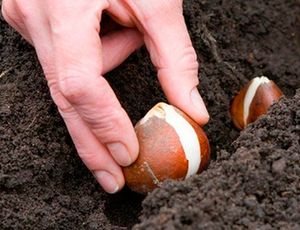 Лучшее время для посадки тюльпанов осенью — середина сентября. Самым простым способом определения своевременности посадки может стать измерение температуры грунта на глубине в 20-30см. К работе приступают, как только она понизится до 10°С. Посадка луковиц, чаще всего, производится в лунки. Предварительно грядку перекапывают. Глубина лунок должна быть равна двум диаметрам луковиц на тяжелых почвах, и трем - на легких (10-15 см). Обычно, тюльпаны сажают рядами на расстоянии в 10см друг от друга, расстояние между рядами должно быть не менее 20см. При таком расположении посадочного материала тюльпаны будут развиваться нормально, а клумба получится достаточно густой и красивой.
