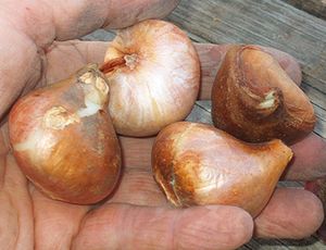 Перед тем, как приступать к посадке, луковицы нужно тщательно отсортировать. Хорошие цветы получают от взрослых луковиц — здоровых, тяжелых, хорошо выполненных, со здоровой и блестящей, плотно прилегающей покровной чешуей. Маленькие луковицы-детки дадут небольшие цветы на коротких цветоносах или вообще не зацветут на следующий год. Крупные луковицы следует сажать посередине клумбы. Мелкие – по краям. Это необходимо для того, чтобы более высокие растения не затеняли низкие. Кроме того, луковицы нужно отсортировать и по сортам. В этом случае клумбы будут выглядеть красивее. Луковички, на которых имеются какие-либо повреждения или пятна, высаживать нельзя. Если они больны, впоследствии будет заражена вся грядка. Перед посадкой луковицы следует на полчаса замочить в темном растворе марганцовки. Это позволит избавить растения от многих вредителей.