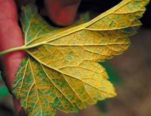 Полосатая (или прожилковая) мозаика настигает кусты вначале лета. Главный и единственный симптом: на листьях, вокруг основных прожилок появляется бледно-желтый узор, который со временем развития становится все ярче. В этом случае не приходится говорить об лечении смородины, единственным выходом будет выкорчевывание куста и его сожжение.