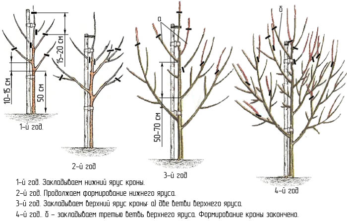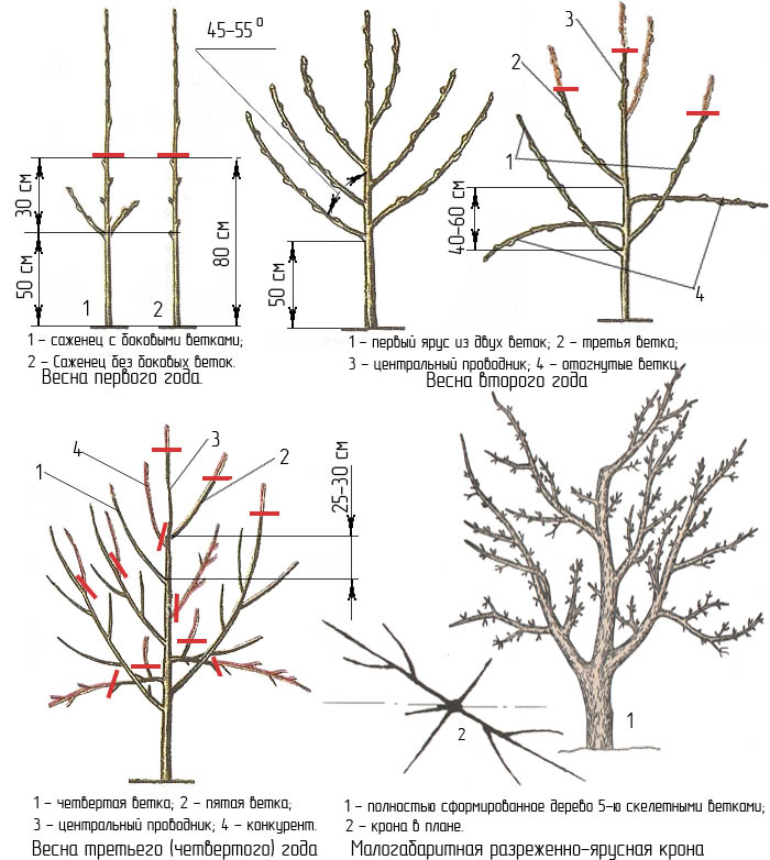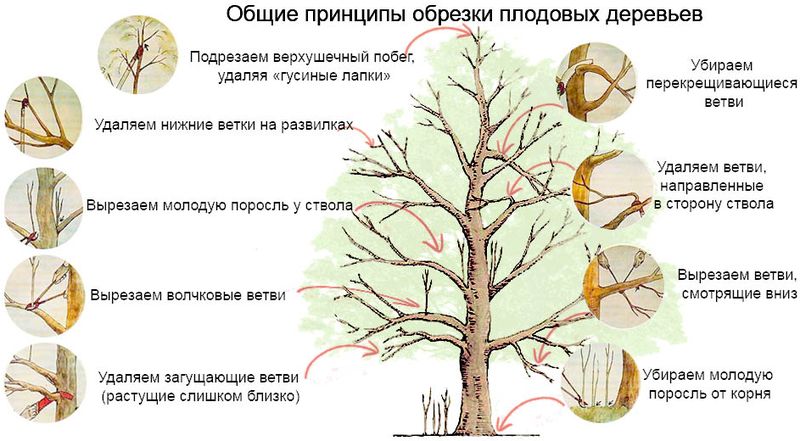 Весенняя обрезка плодовых деревьевДерево имеет корневую и надземную части. Верхняя (надземная) часть состоит из ствола, основных скелетных ветвей и их разветвлений, из обрастающих веток и веточек. Основная часть, находящаяся над землей, это ствол. Часть ствола от корневой шейки до первого разветвления называется штамбом. Большие ветви, отходящие от ствола, имеющие сходный со стволом диаметр и берущие на себя основную нагрузку по поддержке всей кроны плодового дерева, — это скелетные ветви. Часть от нижней скелетной ветви до вершины, называется центральным проводником. От скелетных ветвей отходят побеги, которые и создают основные очертания кроны плодового дерева. Формирующая обрезка плодовых деревьев делается ранней весной, до начала сокодвижения. Ну Урале, обычно, весеннюю обрезку проводят в начале марта. Главное, не пропустить весенний период покоя дерева и сделать обрезку до того, как дерево начинает просыпаться. Это дает гарантию того, что при формирующей обрезке не повредятся цветочные почки, которые закладываются плодовым деревом именно на этой стадии. В противном случае можно лишиться урожая на предстоящий год. Рассмотрим технику формирующей весенней обрезки молодого плодового дерева (яблоня, груша, слива, вишня, арония — рябина черноплодная, рябина обыкновенная, черешня), имеющего несколько центральных проводников, а точнее несколько ветвей, конкурирующих с центральным проводником. Все эти ветви будут конкурировать между собой и с проводником за питательные вещества, солнечный свет и воду. Это отражается на росте кроны плодового дерева, который заметно замедляется. Запущенные плодовые деревья, давно не подвергавшиеся обрезке или обрезанные неправильно, как правило имеют в кроне обилие ветвей разных порядков, срастающихся между собой и стволом под острыми углами, что рано или поздно может привести к отломам таких ветвей при сильных нагрузках и как результат, к болезни и даже гибели плодового дерева. Неправильная или недостаточная формирующая обрезка плодового дерева или кустарника может привести к тому, что в кроне дерева начнут расти равнозначные по своему абрису ветви, конкурируя между собой за свет и соки. По форме такое дерево будет напоминать веник, направленный вверх. Особенно это заметно у вишни. Обрезать дерево, никогда не подвергавшуюся обрезке или обрезанную когда-то неправильно — дело непростое и потребуется приложить достаточно усилий, только чтобы подобраться к стволу, не говоря уже о самой обрезке. Это происходит потому, что плодовое дерево или кустарник обрастает значительной вегетативной массой, не закладывая при этом плодовых почек или закладывая их в минимальном количестве. Урожай с такого дерева будет небольшим и невысокого качества. Для плодовых почек и веточек важно достаточное поступление света в крону, а при его недостатке, они попросту начинают отмирать. Сильно загущенное плодовое дерево не только мало плодоносит, оно становится рассадником болезней и вредителей, которые начинают размножаться в его плотной кроне, куда не попадают лекарственные препараты при обработке. Новые ветви в кроне запущенного плодового дерева, в погоне за солнцем, растут вверх, образуя все новые острые углы. Как правильно сделать весеннюю обрезку плодовых деревьевЕсли мы имеем дело с вишней или слив