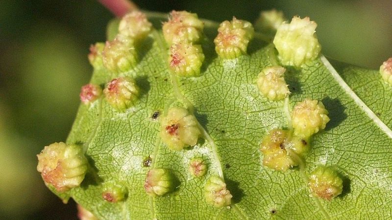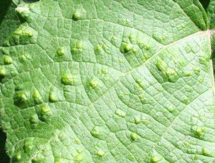 Маленькие желто-красное насекомое длиной с миллиметр. На обратной стороне пораженного листа образуются желто-зеленые неровные наросты. На конях также образуются наросты, со временем корни высыхают и отмирают.
