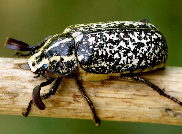Коричневый жук с белыми пятнами на надкрыльях, передние ноги копательные. Длина взрослой особи – 2-3 см, личинки – 6-7 см.
