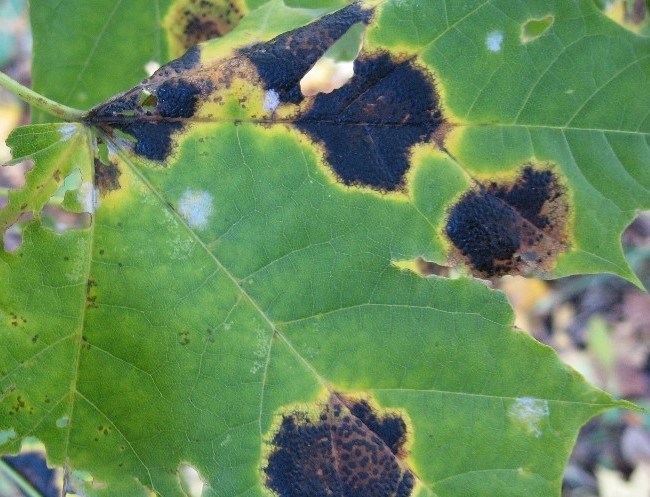 Грибок поражает зеленые листья, побеги, а также одревесневшие части растения. Сначала на молодых побегах обнаруживаются темные пятна, которые постепенно разрастаются и сливаются. Пораженные участки высыхают и разрушаются.