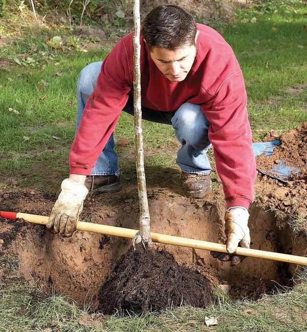Сначала посадочная яма проливается водой. После ее впитывания можно приступать к посадке саженца. Его корневая система аккуратно размещается по бокам холмика на дне ямы. Затем производится поэтапная засыпка саженца грунтом, который, периодически утрамбовывается по краям (чтобы минимизировать усадку дерева).