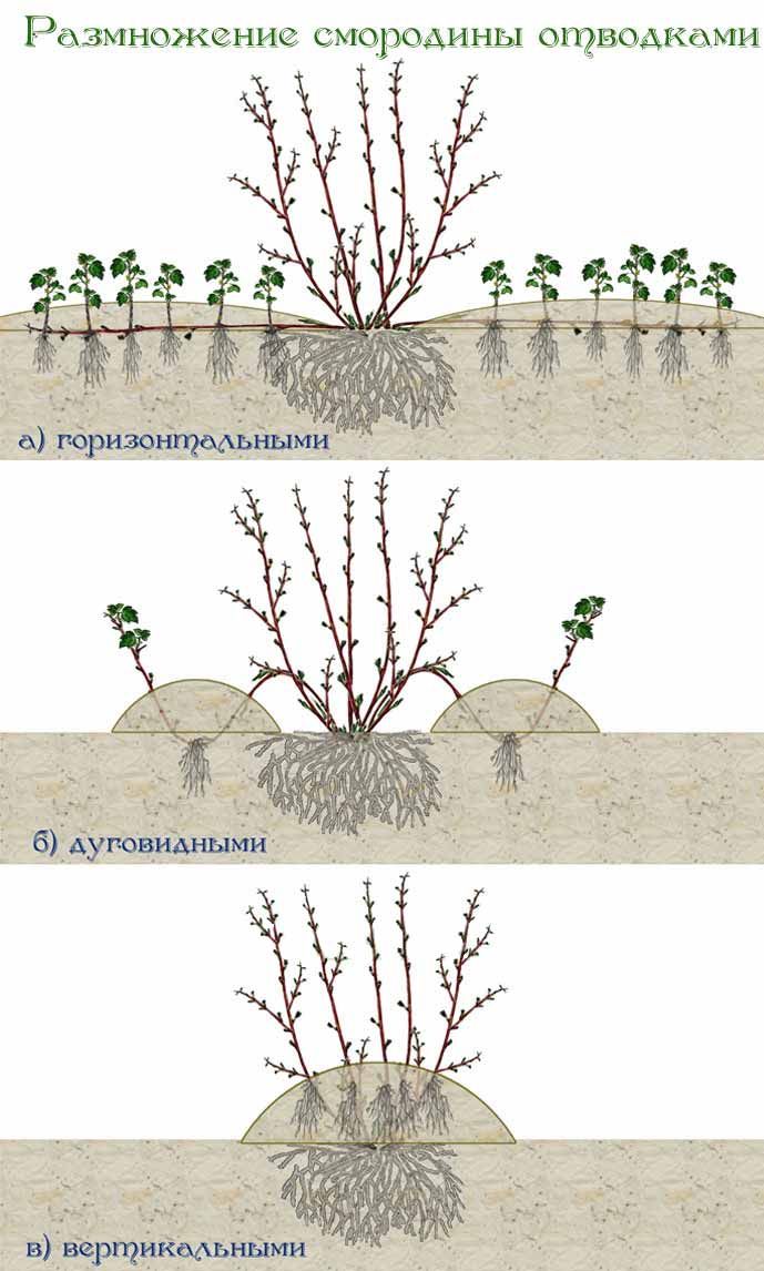 Смородину обычно размножают горизонтальными и дугообразными отводками. Метод в основном применяется для красной и белой смородины. Черную смородину отводками размножают достаточно редко, хотя приживаемость их выше, чем черенков.