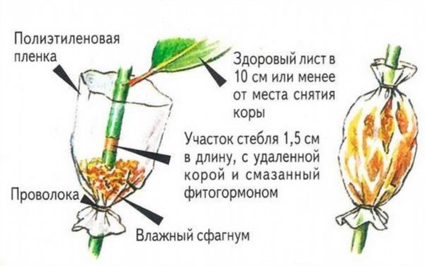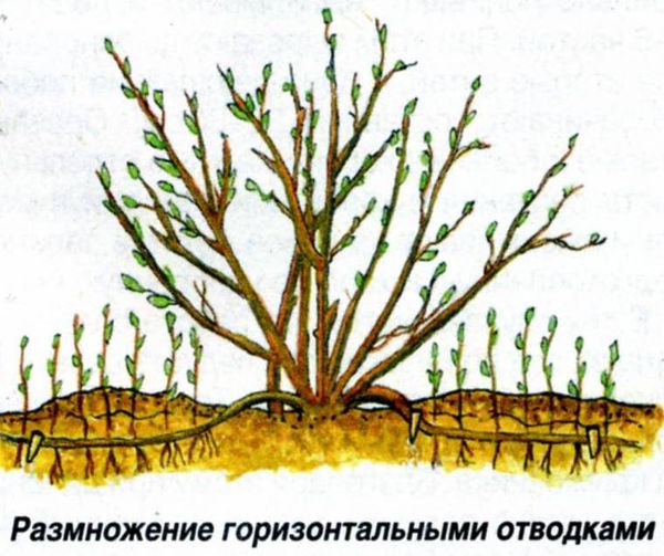 Для получения горизонтальных отводков в земле делают канавку, укладывают в нее ветку, закрепляя ее проволокой, и присыпают землей. Почву обильно увлажняют. Верхний конец побега остается над землей. Распустившиеся листья не удаляют, побег не обрезают.