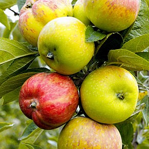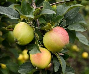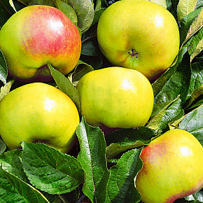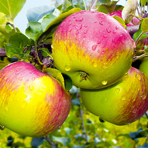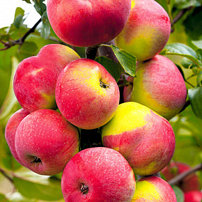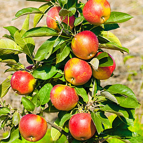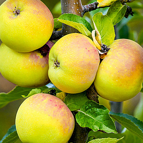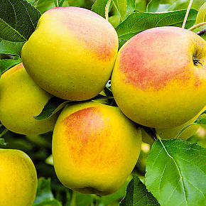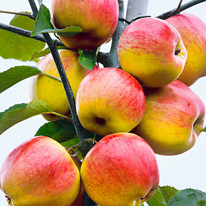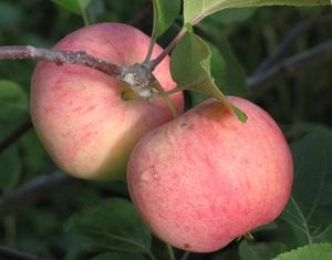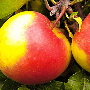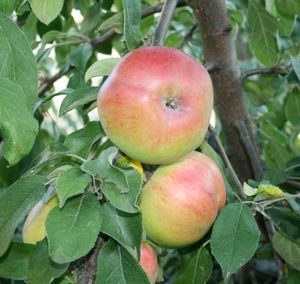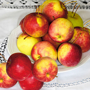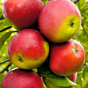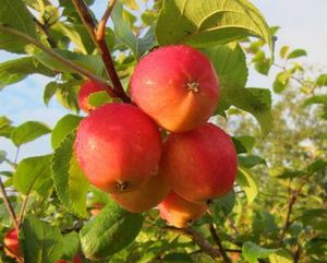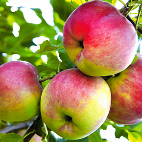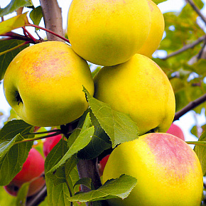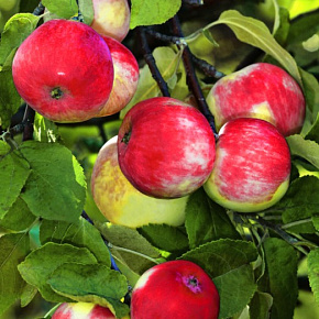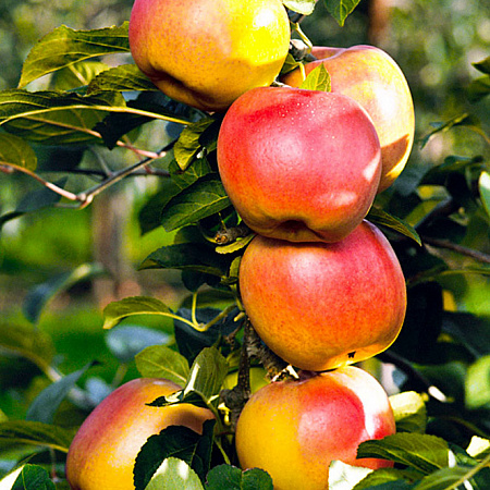 Это яблоня, способная расти и плодоносить даже в экстремальных условиях. Первые плоды уже на 3-4 год! Яблоки зеленовато-желтые с обширным красным румянцем и гладкой блестящей кожицей. Мякоть отличного вкуса, сладкая с кислинкой. Плоды годятся для любых заготовок, осенних салатов, вкусны в свежем виде, хранятся до 140 дней. Растения карликовые, высотой около 2 м с очень хорошей зимо- и морозостойкостью. В сырые годы могут поражаться паршой. Урожай с деревца до 120 кг!