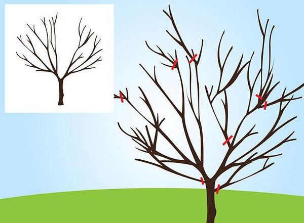 Начиная с третьего года после посадки, приступают к формированию кроны. Первоначальная обрезка заключается в основном в прореживании. Удаляют ветви, направленные внутрь кроны, растущие под острым углом, перекрещивающиеся, а также засохшие и поломанные. Удаляют малоразвитые ветви и оставляют только сильные.
