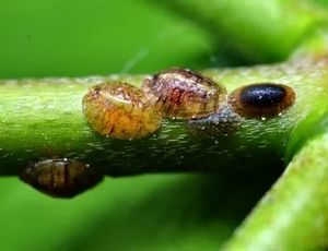 Щитовка откладывают яйца в пазухах будущих почек. Особенно обратите внимание на почки, как только растает снег. Если в некоторых местах почки нормального размера, узкие и вытянутые, а в некоторых — круглые и вздутые, напоминающие миниатюрные кочаны капусты — то там живет щитовка.