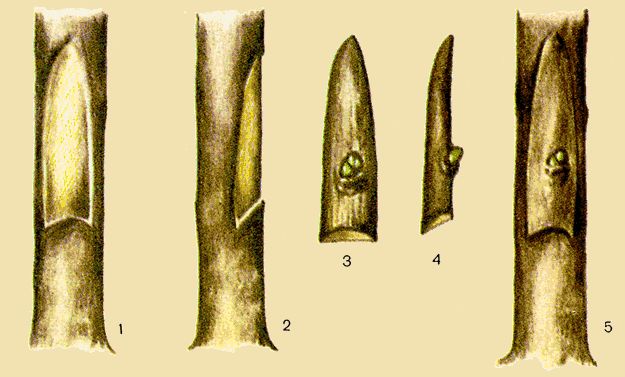 Для весенней окулировки используют растущую почку, образовавшуюся еще в прошедшем сезоне и дающую первый прирост в наступившем.
