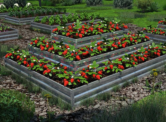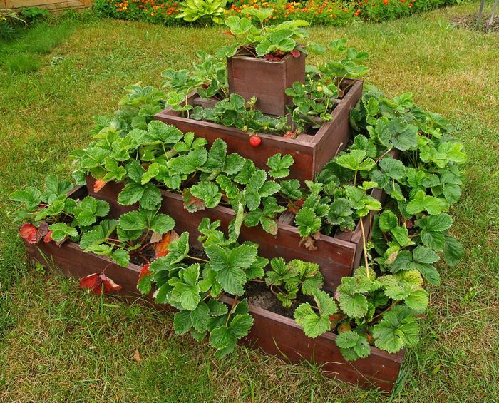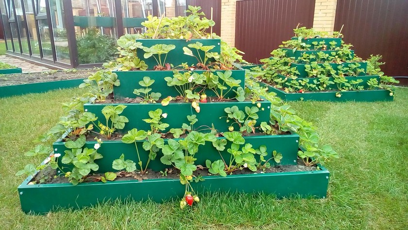 На пирамидальной конструкции лучше всего выращивать ремонтантные сорта клубники. Они отличаются повторным цветением и неравномерным созреванием ягод, что позволит наслаждаться красотой грядки и урожаем длительное время. Также многоярусная форма грядки подходит для посадки ампельных сортов клубники. Каскады из листьев и спадающих вниз побегов, усыпанных красными ягодками и маленькими звездочками соцветий производят завораживающий декоративный эффект.