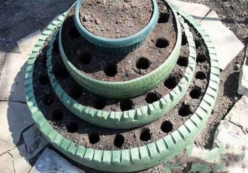 Самый простой способ сделать грядку-пирамиду на участке - использовать для ее возведения старые автомобильные покрышки.