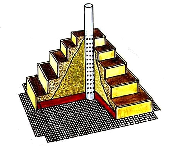 Земля под грядку очищается от камней и выравнивается. Выкапывается яма, по размерам соответствующая половине высоты самой большой покрышки и полному ее диаметру. Яма застилается сеткой-основой (см. выше).