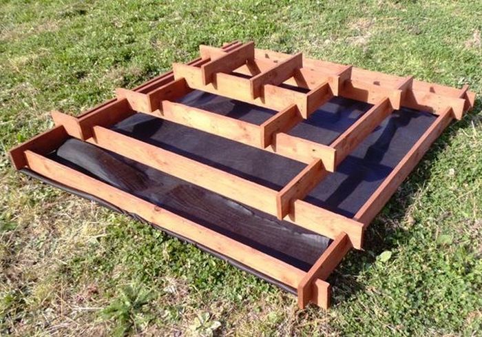 Первоначально готовят основание для грядки. Металлическую или пластиковую мелкоячеистую сетку располагают на участке, где будет стоять будущая конструкция. Сетка будет защищать конструкцию от мелких грызунов.