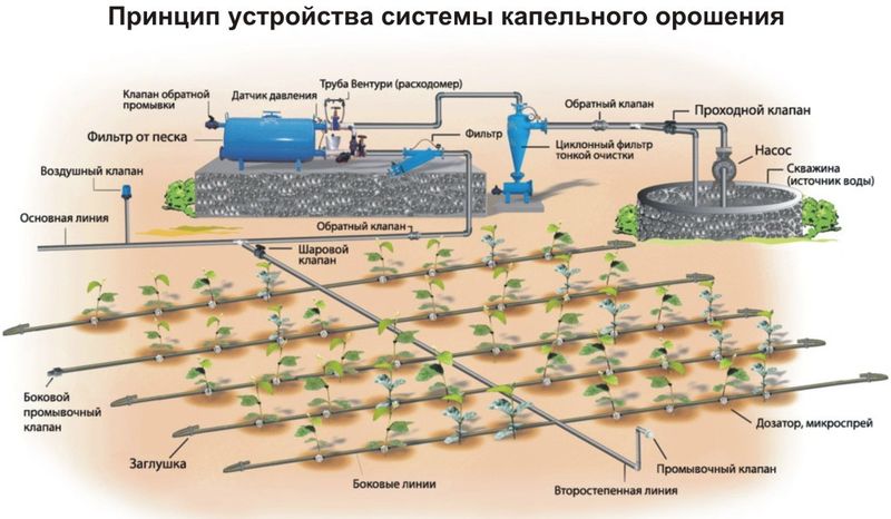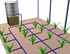 Система капельного полива представляет собой разветвлённую систему водоводов, при помощи которой производится подвод жидкости в прикорневую область растений. Суть функционирования чрезвычайно проста. Вода вначале попадает в накопительный бак из водопровода или закачивается из скважины, далее по магистральным трубам, а затем по капельным трубкам транспортируется непосредственно к посадкам