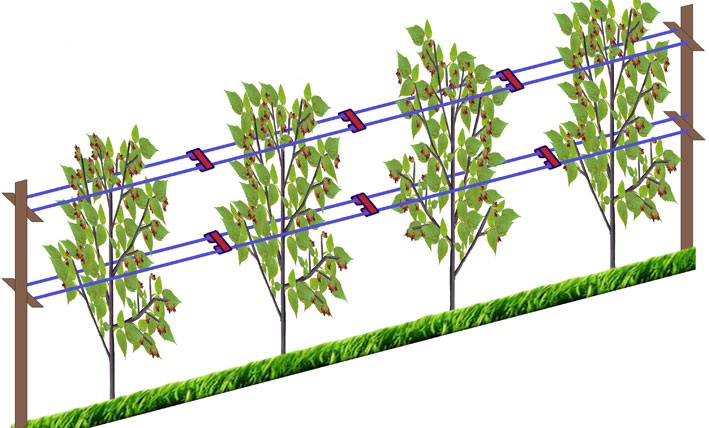 Шпалерный – вдоль кустарников натягивается проволока, к которой привязываются побеги. Это наиболее лучший вариант, позволяющий максимально быстро созревать ягодам, полностью проветриваться и в достаточном количестве получать лучи солнца.