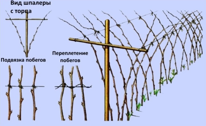 Как можно понять из названия описываемая конструкция выполнена в виде опор Т-образной формы. Основным материалом для устройства стоек такой шпалеры считаются деревянные брусья, металлические трубы, а также обрезки арматуры. Обычно такие элементы в верхней части закрепляют перпендикулярно друг к другу. Ряды проволоки нужно закрепить по выступающим краям планки. Во время формирования куста побеги укладывают на разные рукава шпалеры. В данном случае в центре растения начинает формироваться молодая поросль, которая почти не затеняется основными плодоносящими растениями.